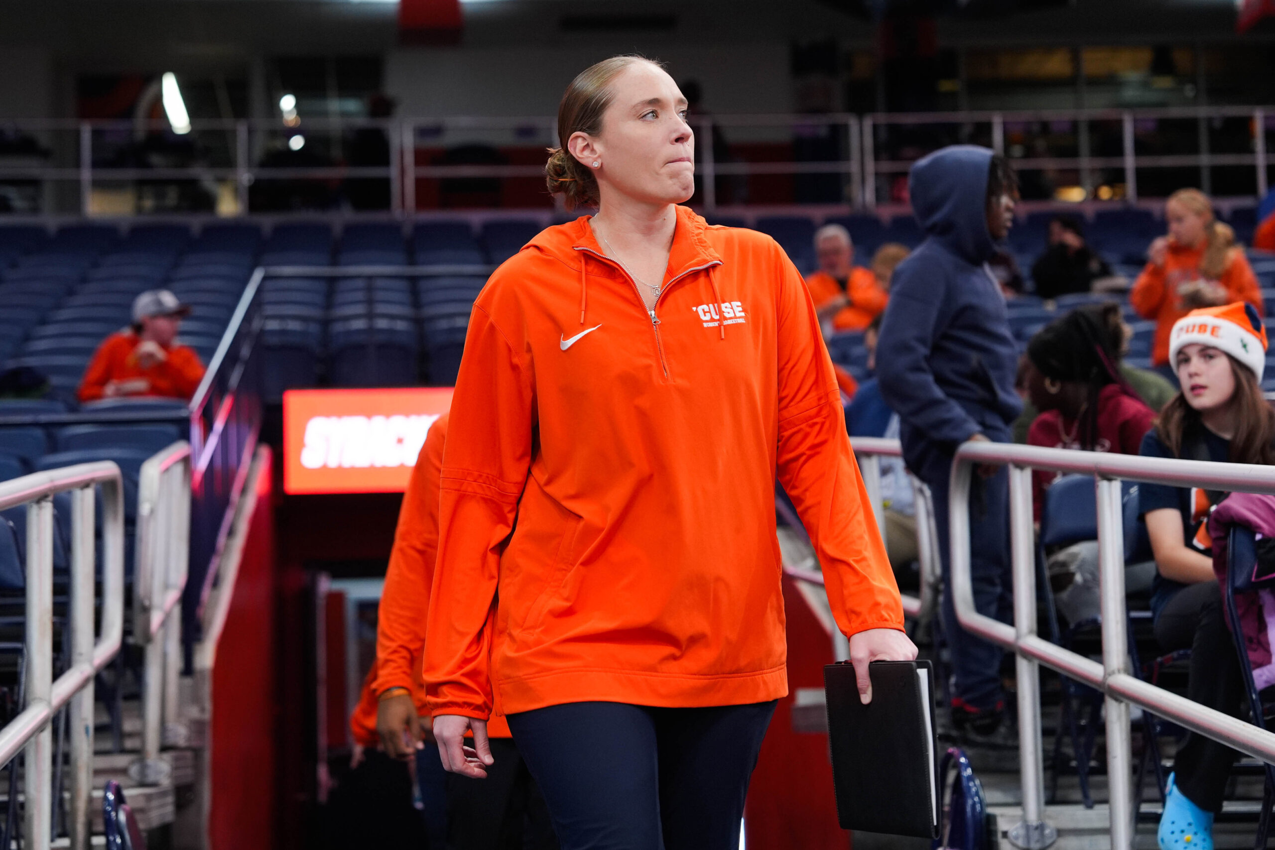 Kristen Sharkey walks into the JMA Wireless Dome, donning an orange Syracuse quarter zip. In her final season with the Orange, Sharkey served as Felisha Legette-Jack’s associate head coach. Courtesy of SU Athletics