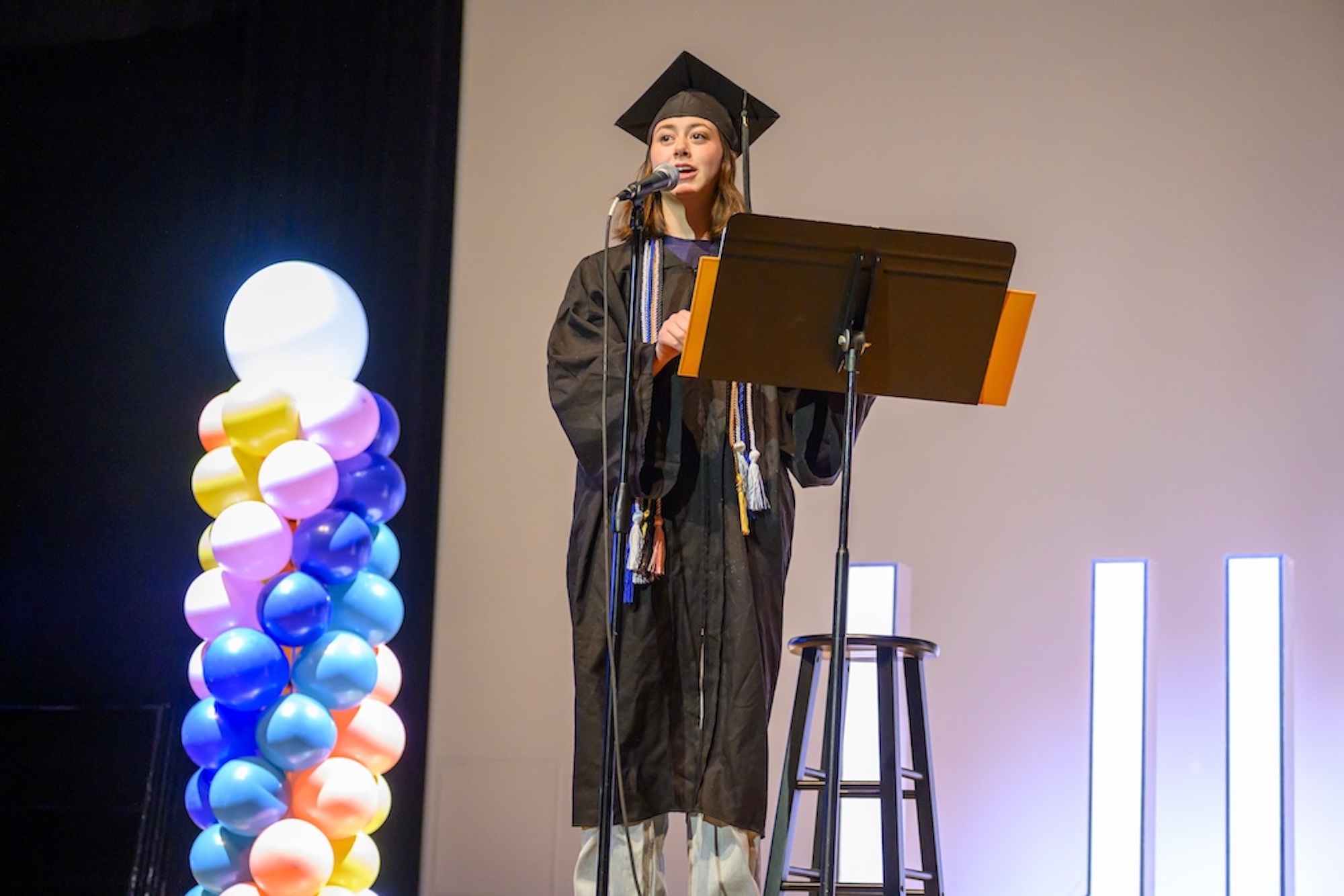 Shalaby, who graduated from SU in 2024, opened the night by walking out in a cap and gown with the “graduation speech that (she) never got to give” prepped and ready on a music stand.