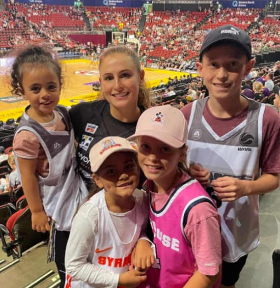 Tiana Mangakahia poses with her nieces and nephews at a WNBL game. Over the final year of her life, Tiana coached her niece and nephew — Kaylee and Aven Mangakahia — at Faith Lutheran College Redlands. Courtesy of Cynthia Mangakahia
