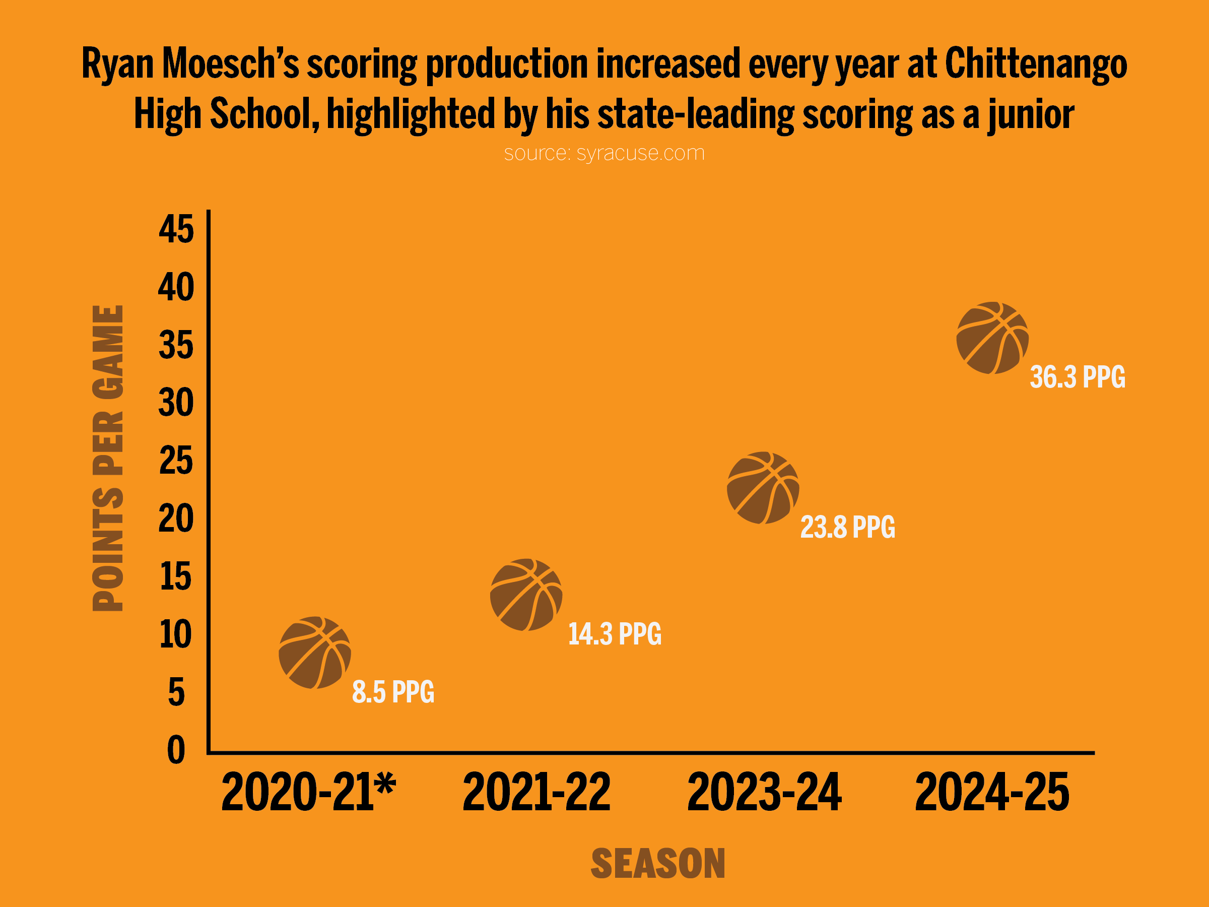 Ryan grew up with a basketball in his crib, Jeff said. Jeff played basketball at Cortland State and served as an assistant coach for Chittenango for two decades, including three years coaching Ryan. Ryan’s brother, Alex Moesch, is currently a guard at Hobart College.