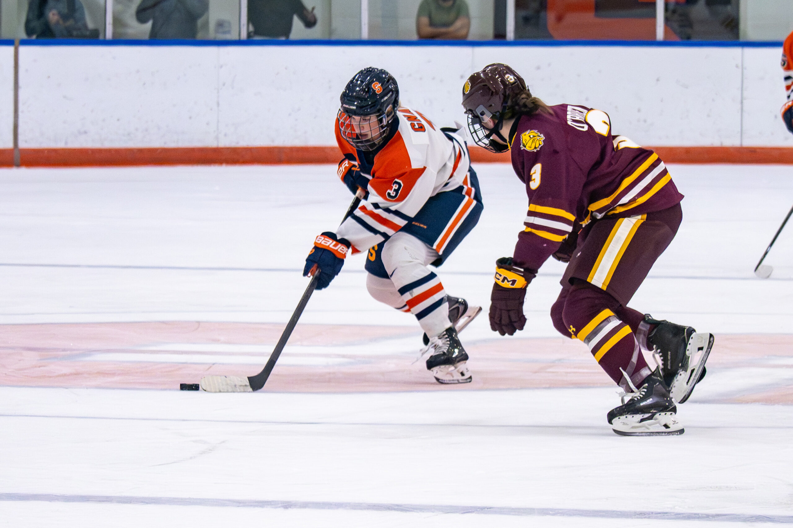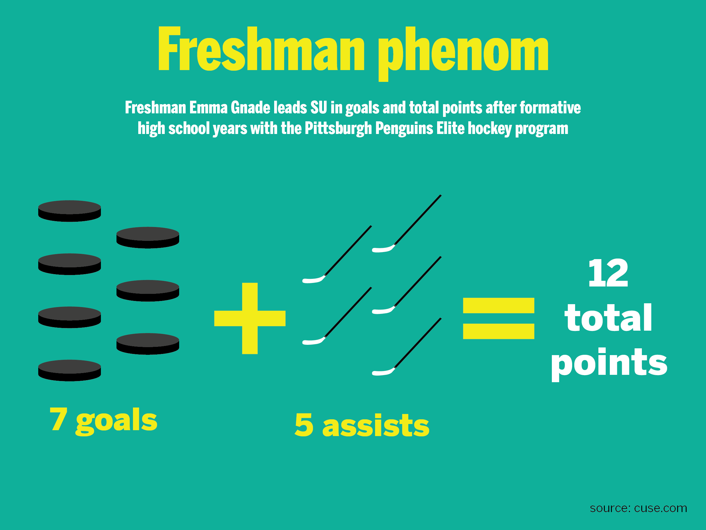 That responsibility is nothing new for Gnade. She became accustomed to it during her time with the Pittsburgh Penguins Elite hockey program, where she spent most of her high school career honing her craft at an NHL-caliber training facility. That experience prepared her to transition to SU, where she now leads the team with seven goals and 12 points as a freshman.