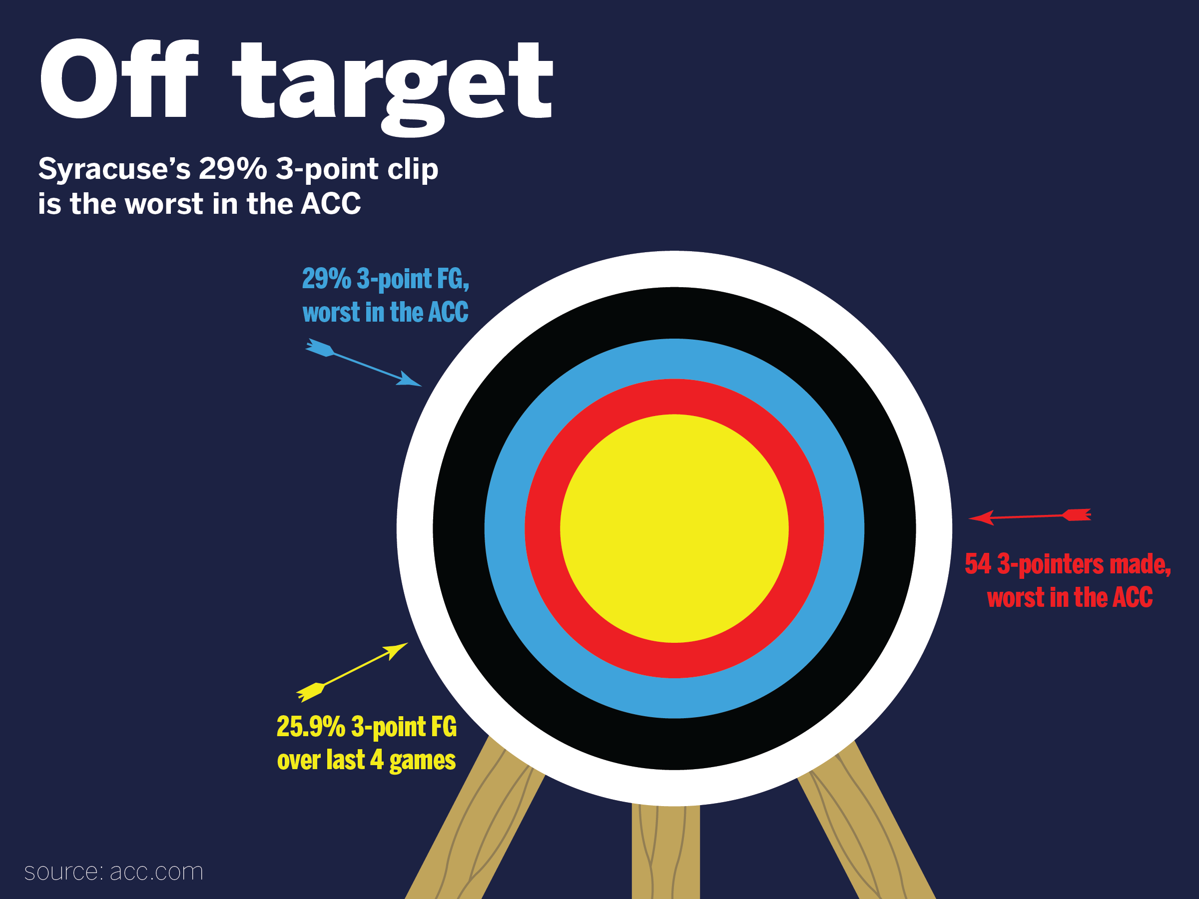 Much of the attention surrounding Syracuse’s shooting woes often points to the free-throw line, where it ranks near the bottom of the country. But the Orange have produced just as poorly from beyond the arc. Syracuse is shooting 29% from 3 overall this season, 3.8% lower than last year. In its last four games, it shot 28-for-108 from 3, good for a 25.9% clip.