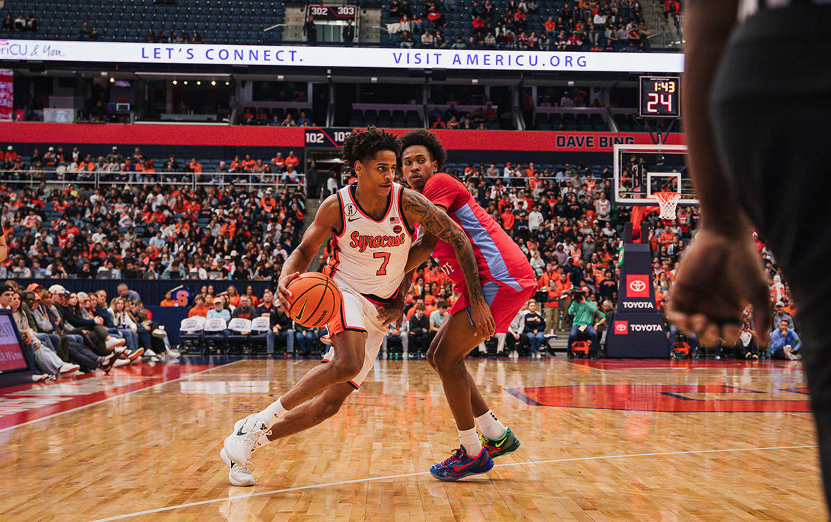 Kiyan Anthony dribbles around a Delaware State defender. Despite mostly coming off the bench, Anthony leads SU with 142 total points in his freshman season. Avery Magee | Photo Editor
