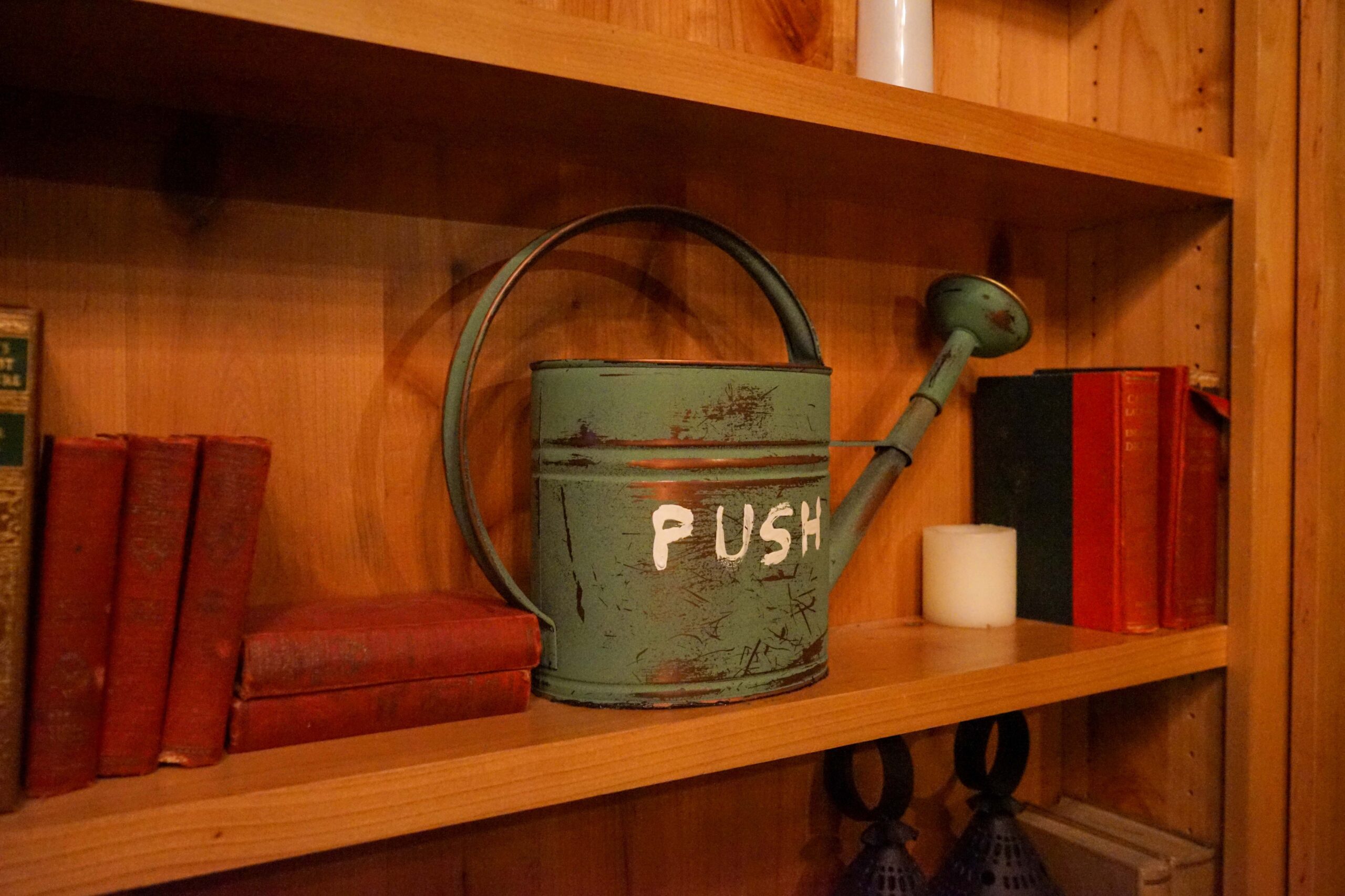 In the back of Harvey’s, customers discover a bookshelf filled with old legislative books and a metal watering can painted with the word “PUSH” where The Cabinet Room lies.