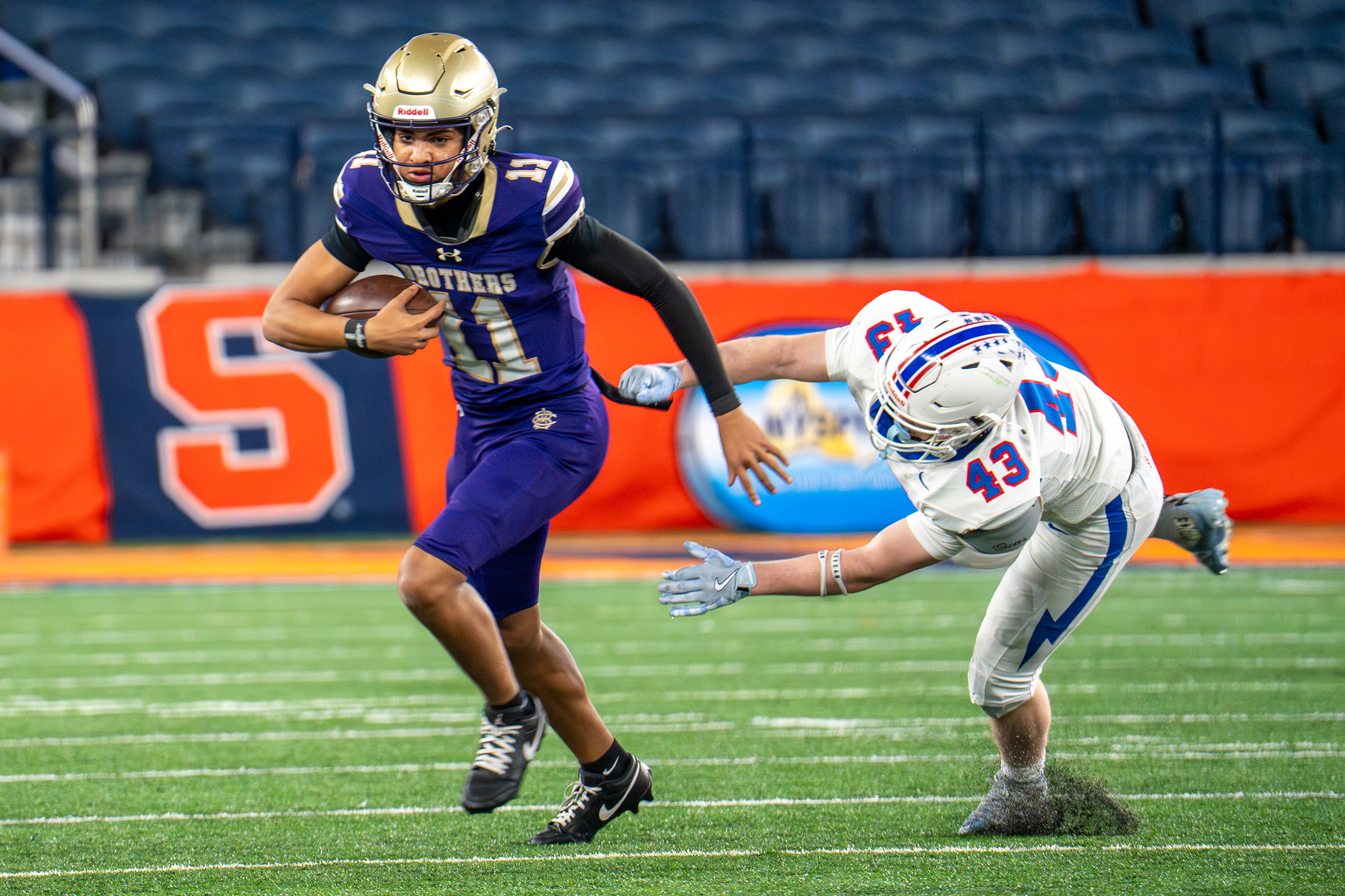 CBA quarterback Gradyn Dixon avoids a tackler in the Brothers’ state championship win over Saratoga Springs Dec. 6, 2025. The win completed CBA’s three-peat as Class AA state champions. Peter Radosh | Asst. Copy Editor