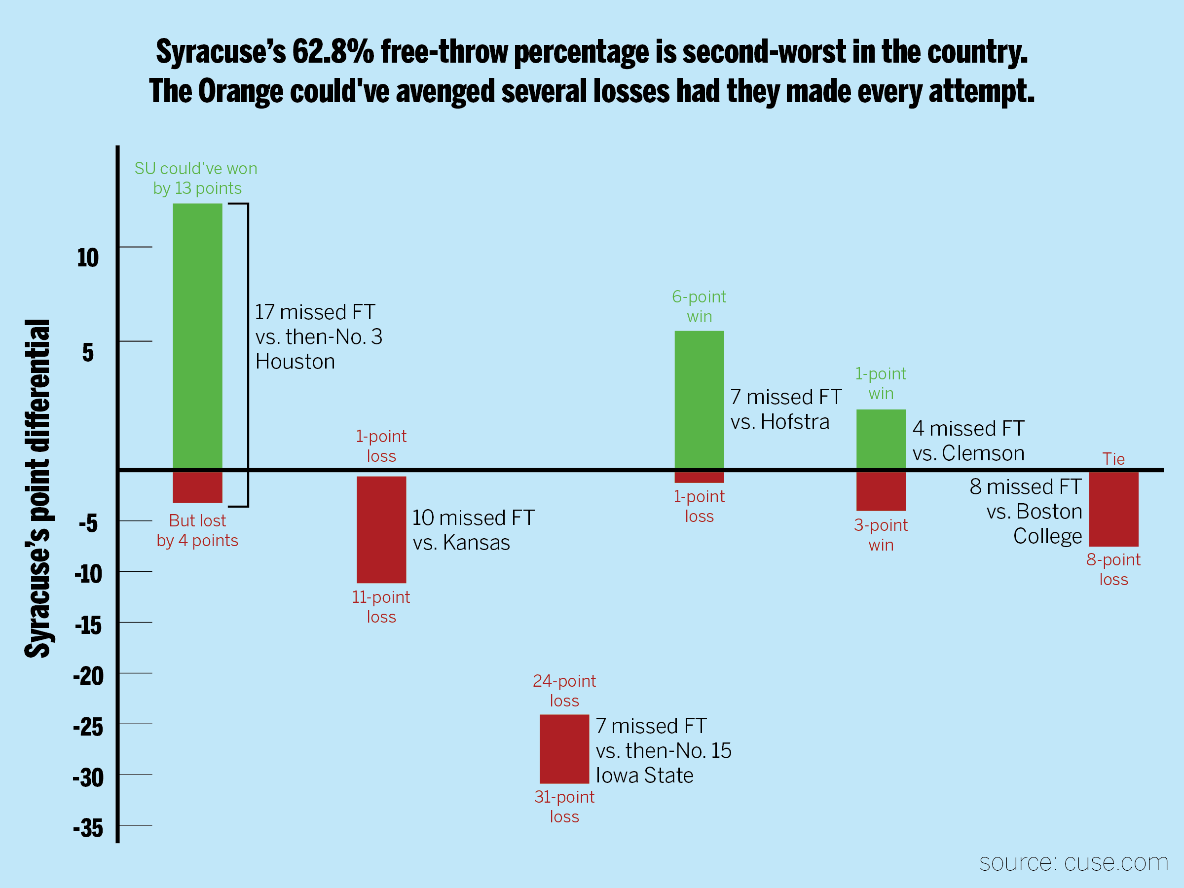 This past Saturday in Chestnut Hill, Massachusetts, Syracuse went 14-for-22 from the free-throw line in its 81-73 loss to Boston College. Eight missed free throws; eight points separating SU from BC.