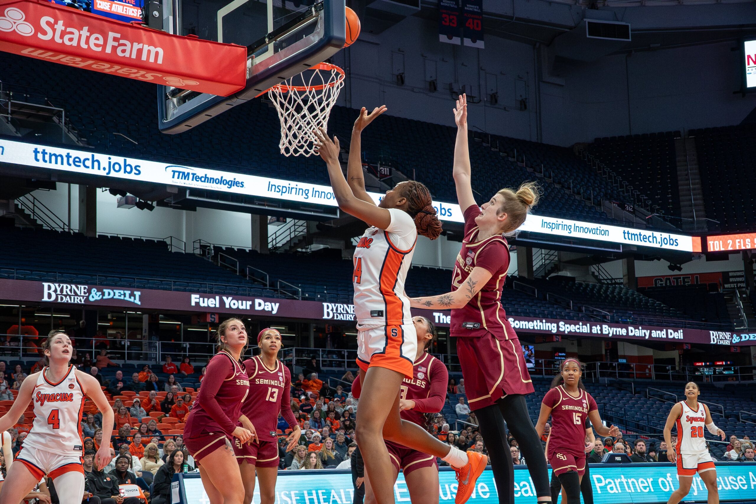Syracuse got two buckets in transition soon after, but Florida State hung around. Risch and Sydney Bowles nailed back-to-back 3s to cut SU’s lead to four with just over two minutes in the frame. Darius showed some signs of life for the Orange, though, responding with a 3-pointer.