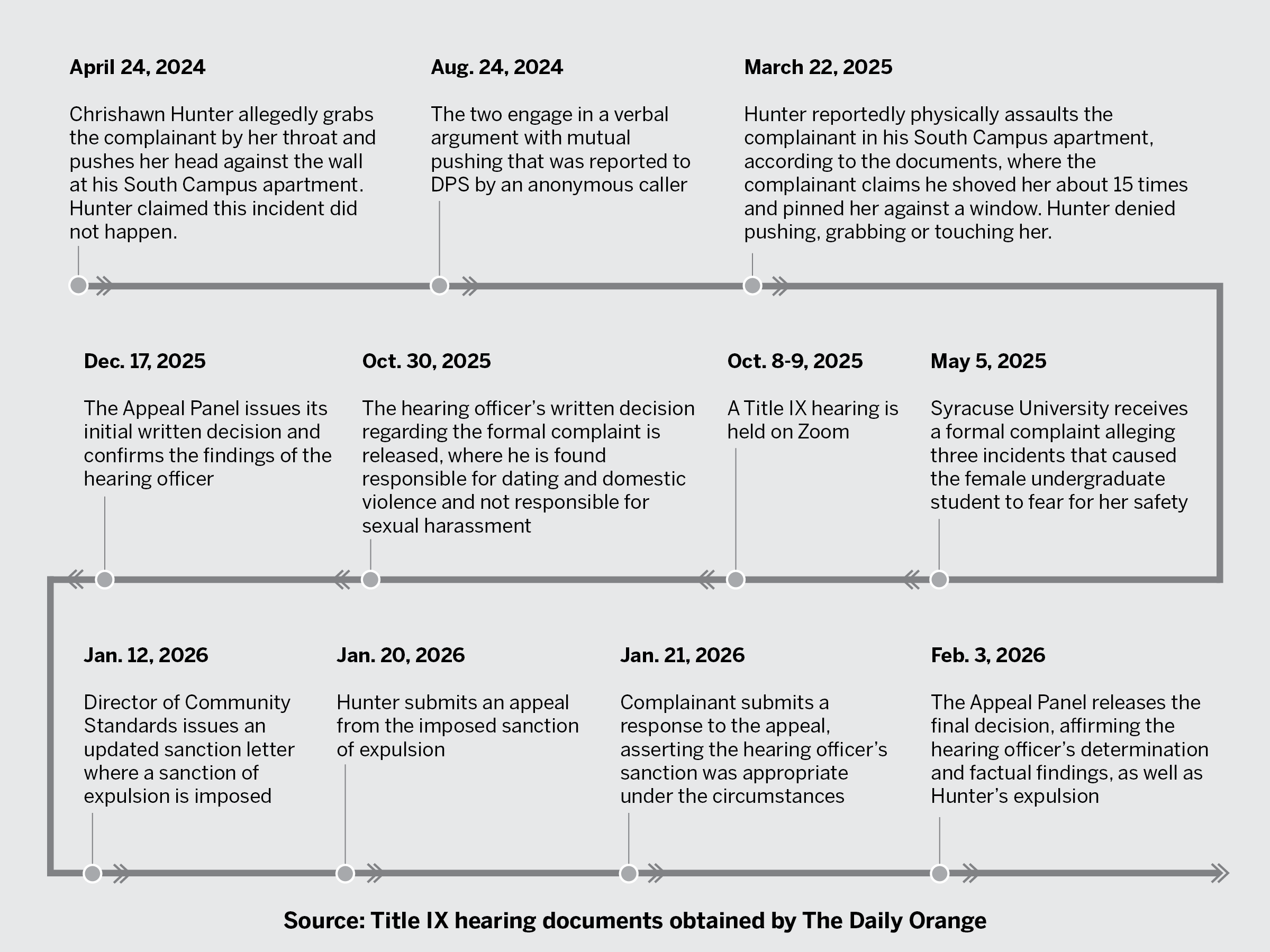 Syracuse University received a formal Title IX complaint against Hunter on May 5, 2025. The complainant, a female undergraduate student, alleged three incidents that caused her to fear for her safety, according to hearing outcome documents obtained by The Daily Orange. The two are no longer involved with each other.