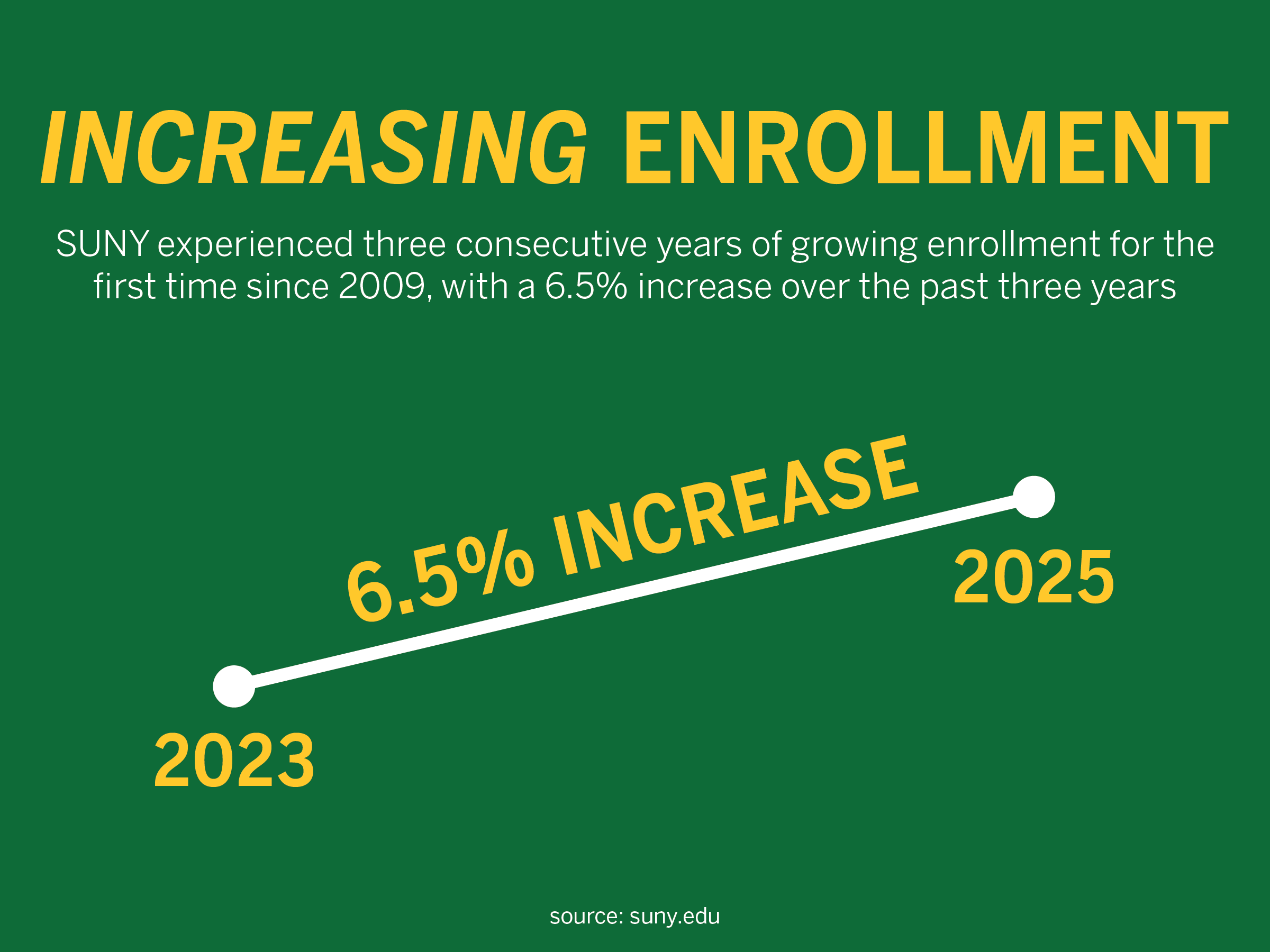 SUNY enrollment increased by almost 3% from 2024 to 2025 and 6.5% over the past three years, according to the report. This is the first time the system has seen three consecutive years of growing enrollment since 2009.