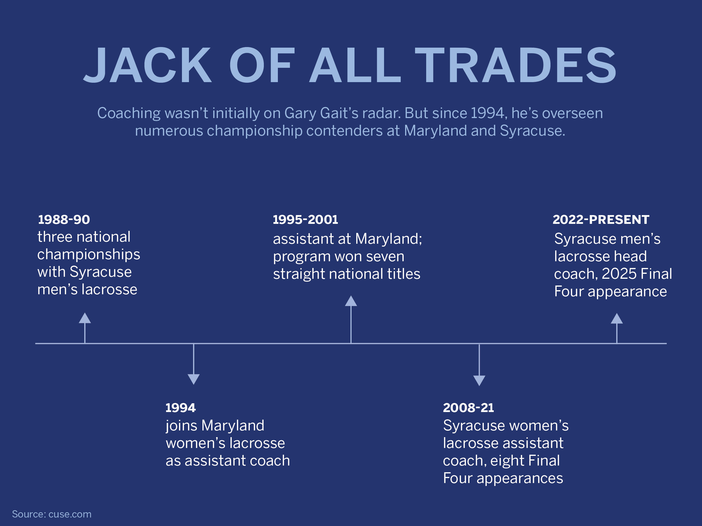 Lacrosse’s revolution in the men’s and women’s game can be attributed to Gait. He gave the sport new life by pulling off the impossible as a player at Syracuse. He furthered that by adding wrinkles coaching at Maryland, but Gait’s tenure in College Park ended on a sour note.