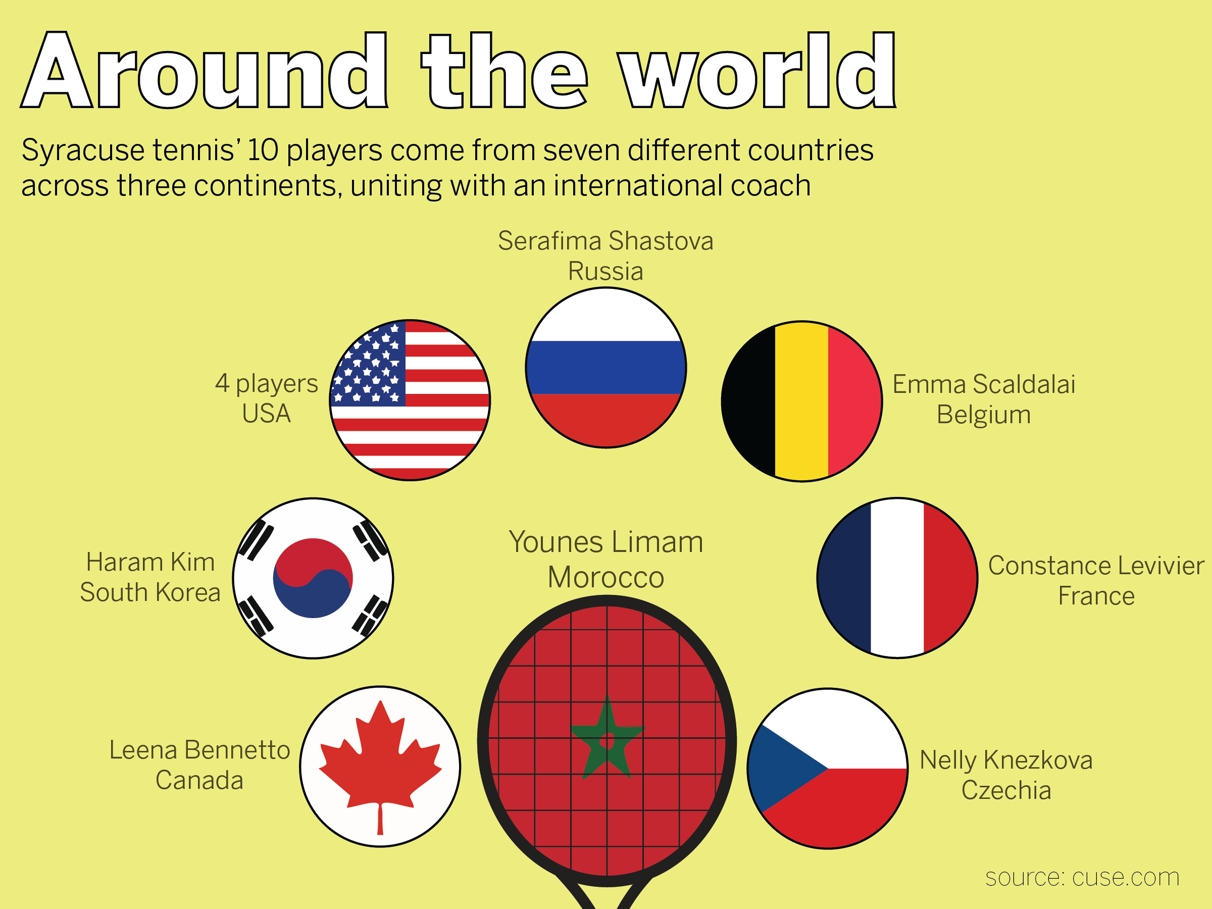 Syracuse tennis’ 10 members represent seven nations, from the U.S. to France, Russia and South Korea. Each player brings their own style of play to the Orange, and it shapes their identity as a team.