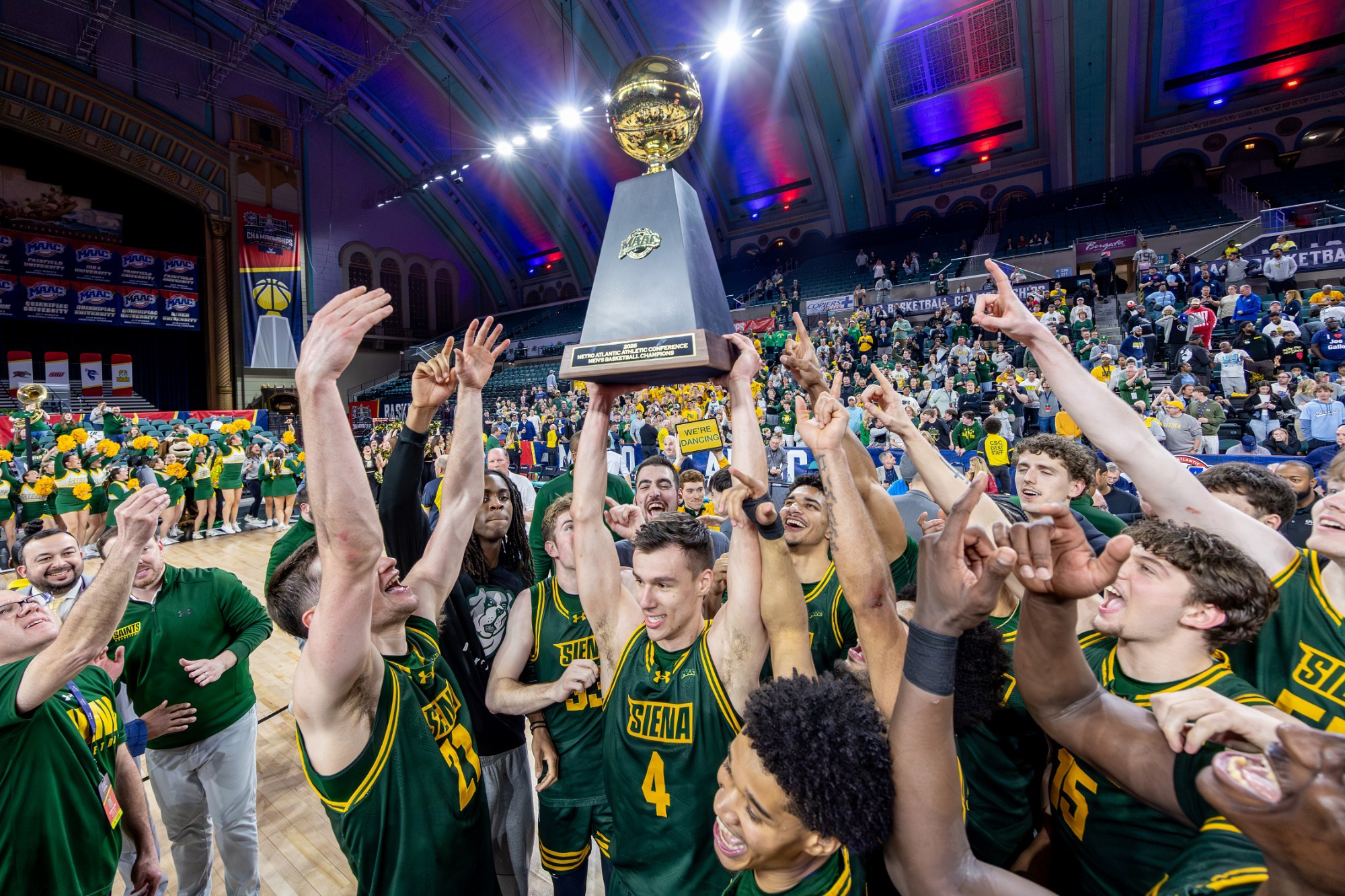 Gavin Doty celebrates the MAAC Tournament title March 10. Doty was named MAAC Tournament most valuable player and led the saints with 17.9 points per game this year. Courtesy of Siena Athletics