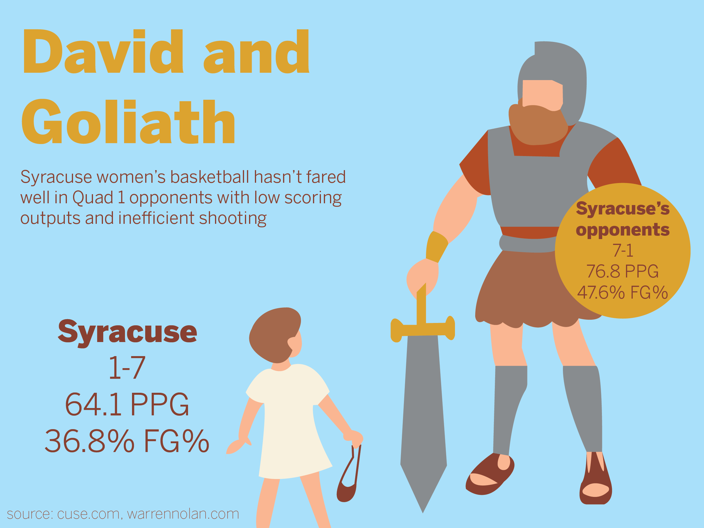 The best teams, though, will be remembered for how they performed against the Goliaths. And while Syracuse’s success this season is encouraging, it’ll feel unsubstantiated if the Orange don’t capitalize on the opportunity to compete in March.