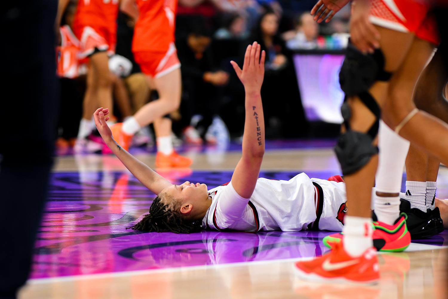 Louisville’s Imari Berry lies flat on the Gas South Arena hardwood after inducing a foul. The Cardinals got out to a hot start Friday, leaving Syracuse in the dust early. Courtesy of the Atlantic Coast Conference