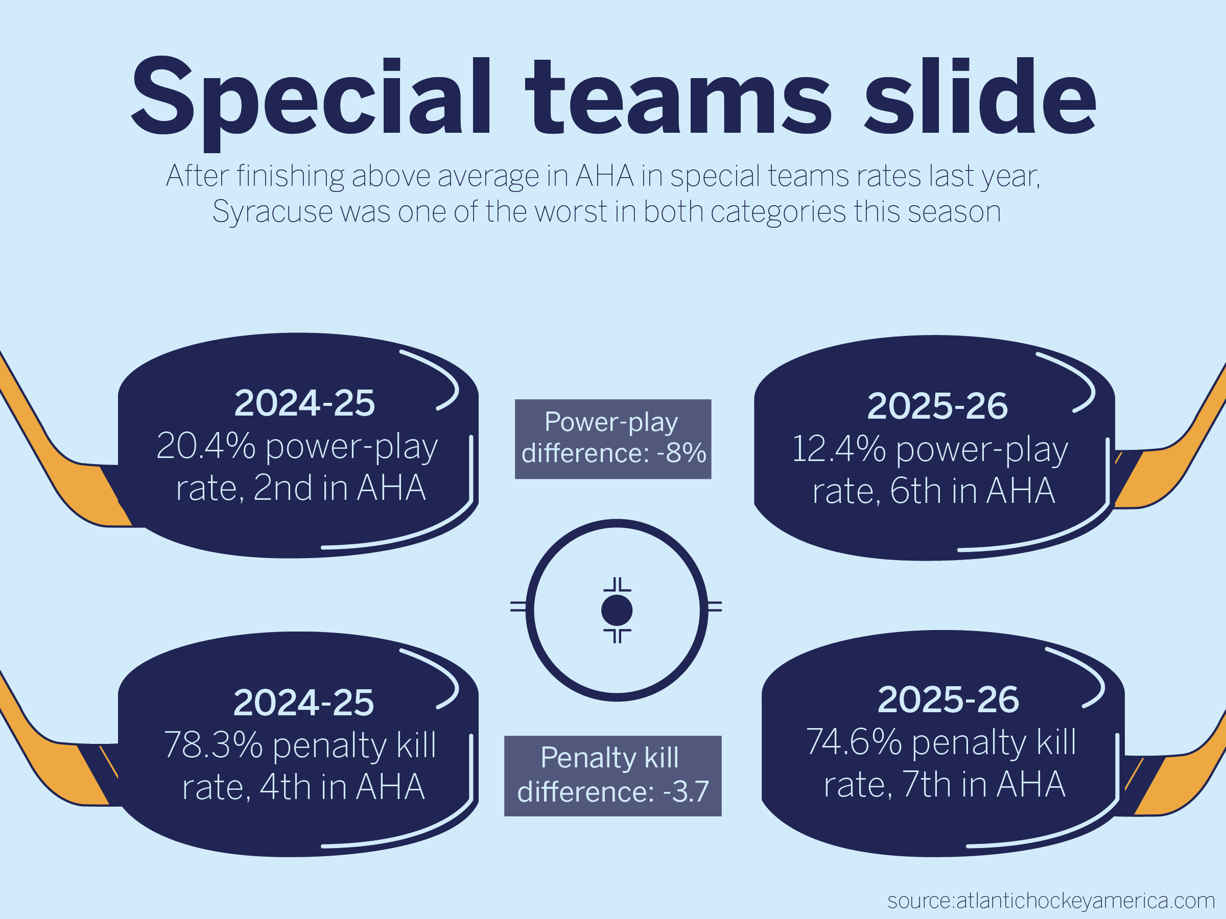 SU’s 78.3% penalty kill last season ranked fourth in the AHA. This year, however, it plunged to just 74.6%, the worst in the AHA, even behind Delaware.